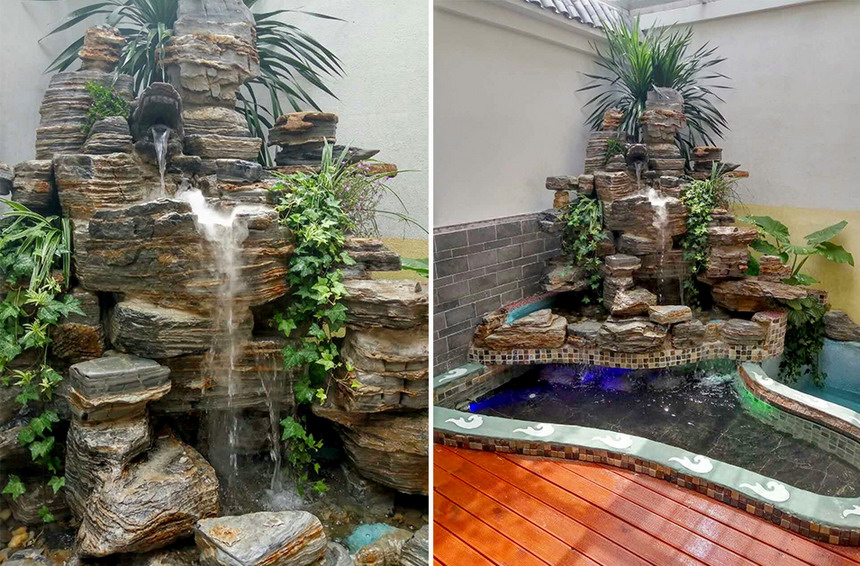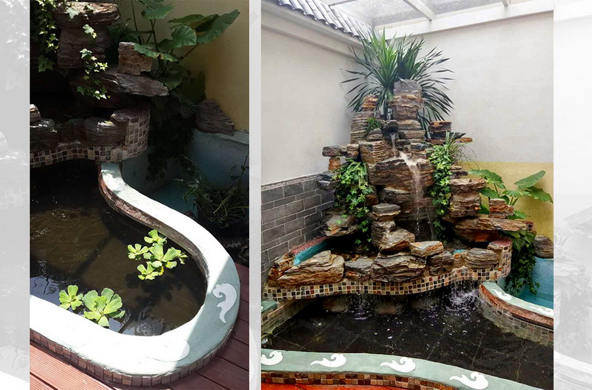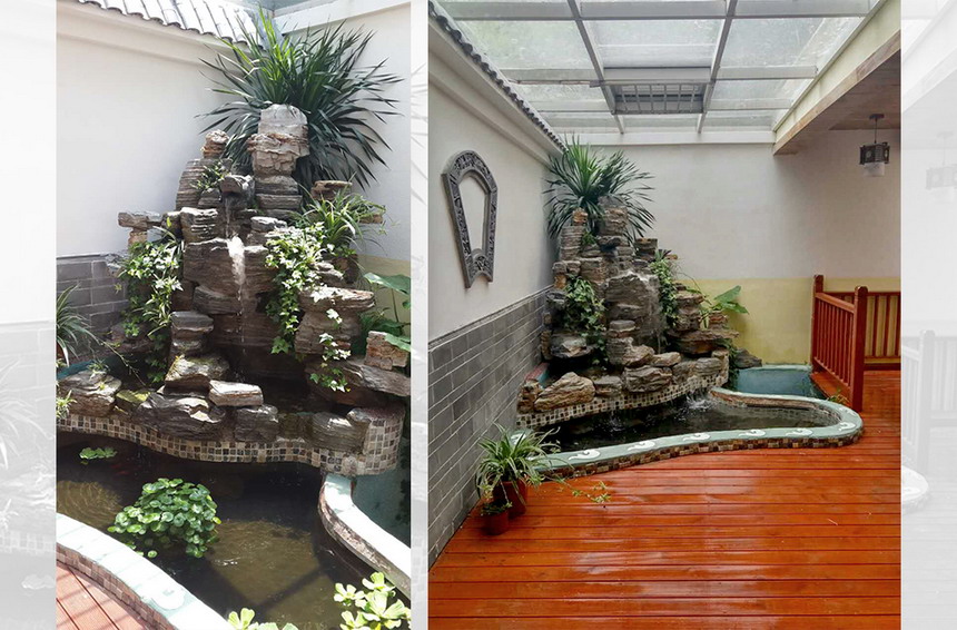 本案是室内阳光花园,项目位于北京市顺义区,客户因为小区的龙湖二字选择了居住在这里,对龙字情有独钟,所以地下室的水池边缘设计成了蜿蜒的形态,假山上部的出水口是一个石雕的龙头,三层叠水的可分别养锦鲤和乌龟,各得其乐。