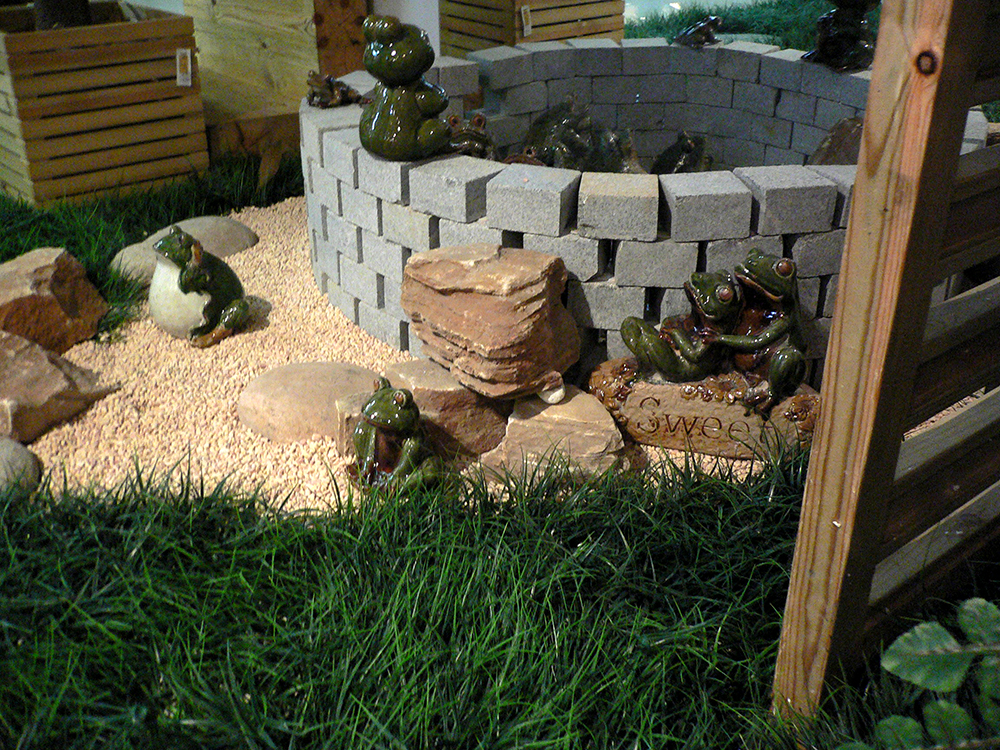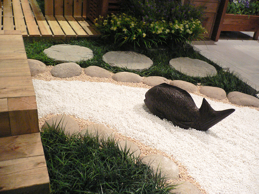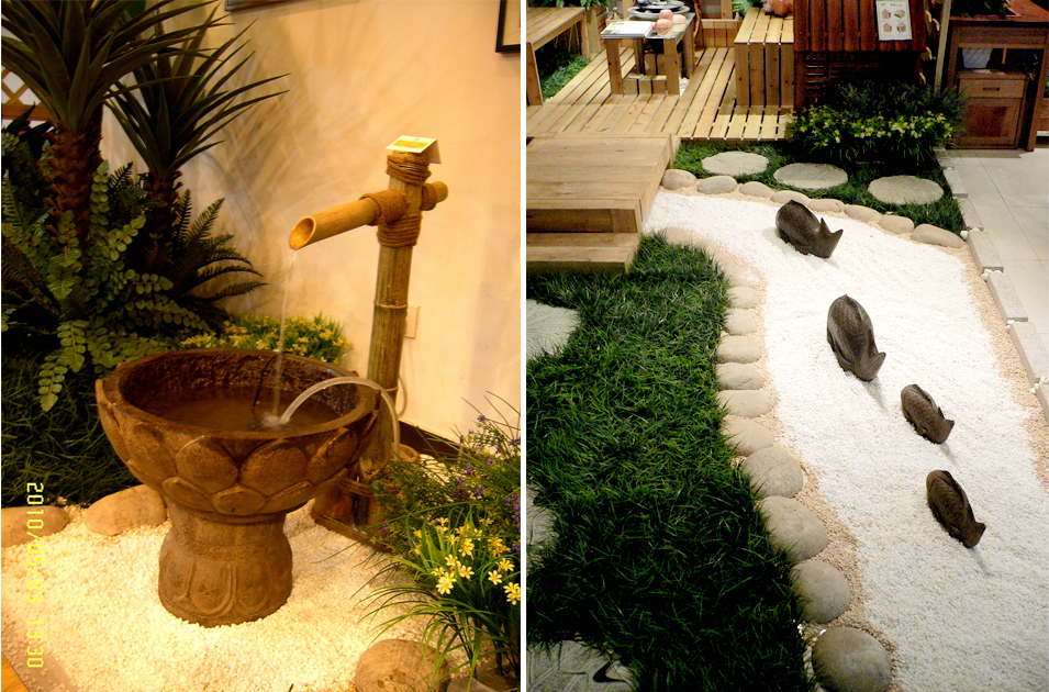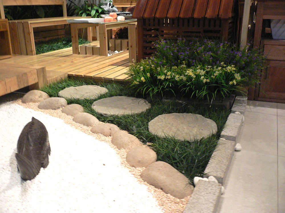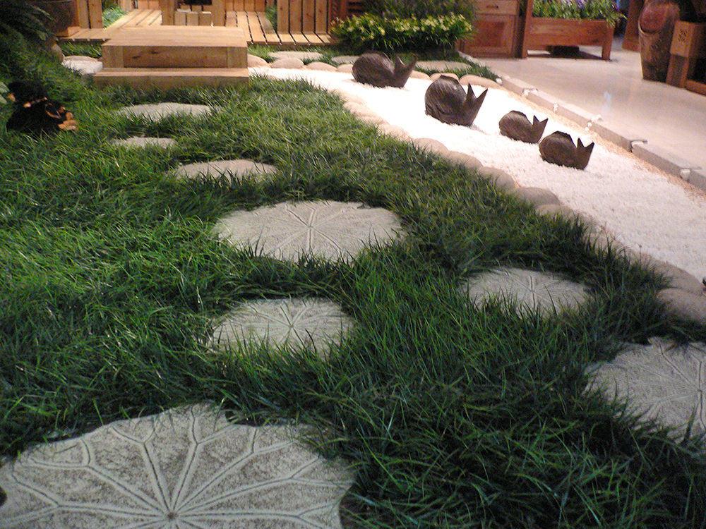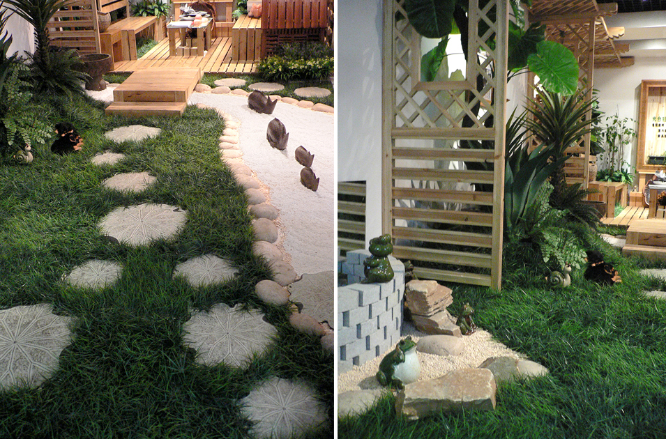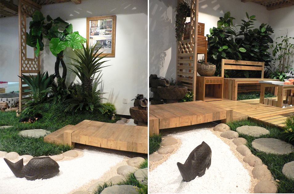 这是四土田店面展示空间的花园设计,受采光通风等因素影响,全部采用仿真植物造景并结合原石、青石水景、石鱼、石灯、小品等元素打造的一款极具田园风情的室内庭院。