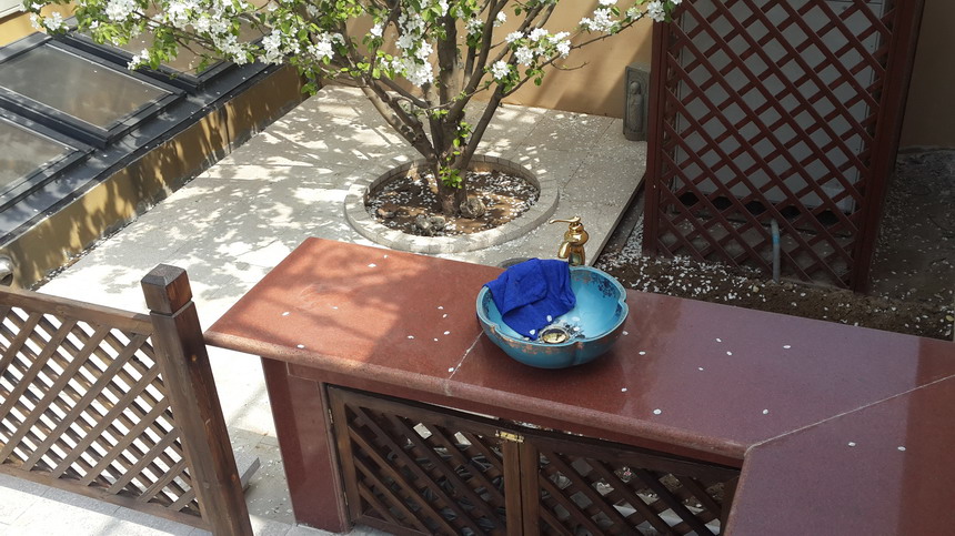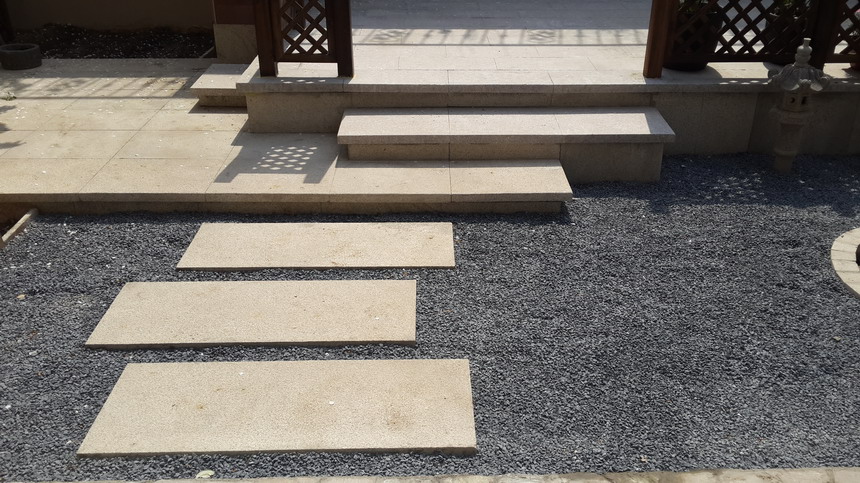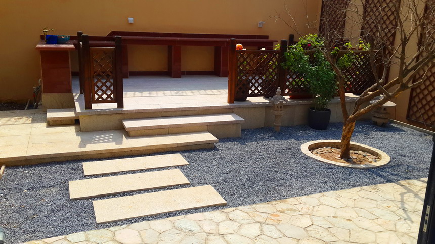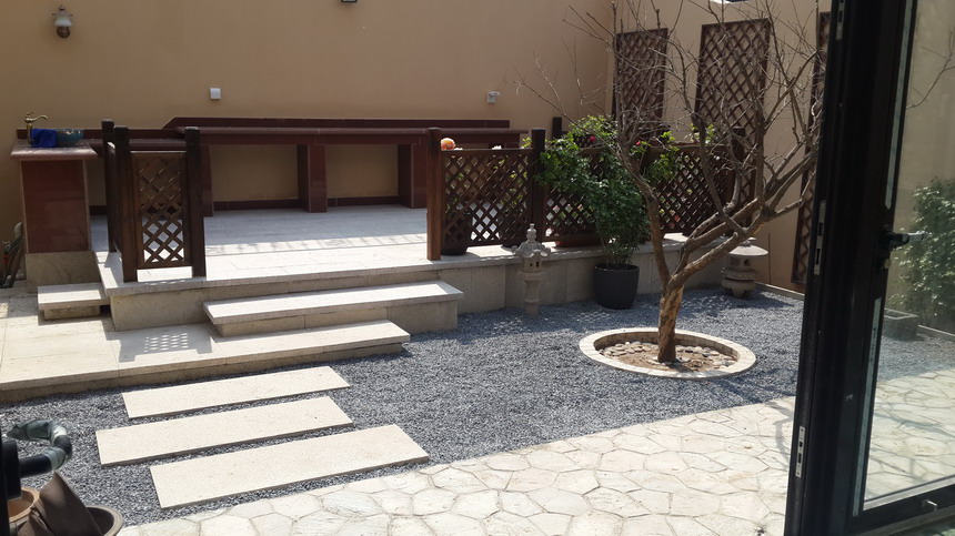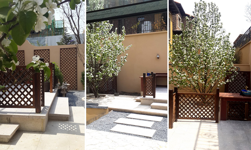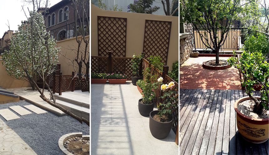 本案是日式庭院花园,项目位于北京市昌平区,地势的设计在本案中很关键,南侧围墙很高,在院子里形成大面积的阴影,阴气重,所以设计了台地的形式,抬高墙角的休息平台,让阳光更多的照进庭院,更加充满生机。庭院中部的碎石地面是整个院子的排水系统,隐蔽有清洁。