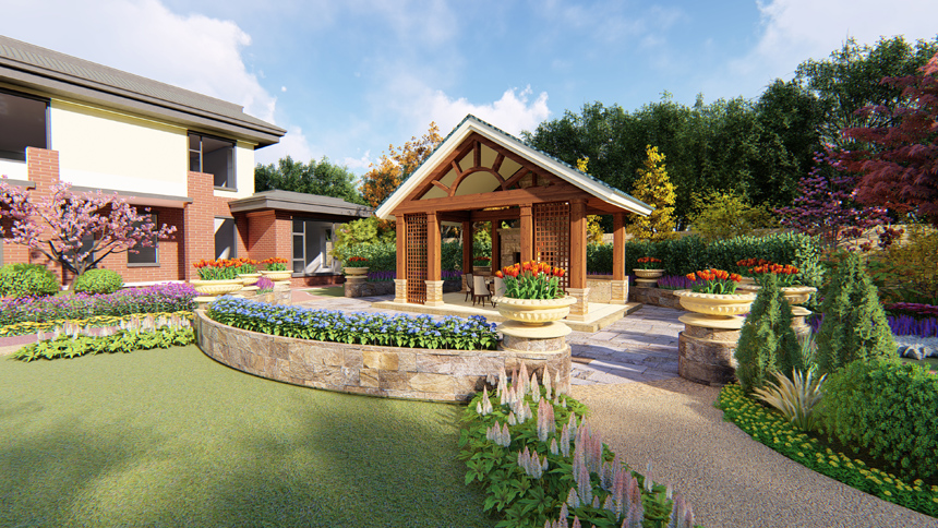 休息区位于中轴的东侧,有二层弧形半围合形式。第一层是北海道黄杨形成的围合,第二层是花卉形成的围合,中间休息亭安放此处,二重围合象征家庭的团圆与温暖的环抱。这样设计,庭院不单单是户外空间,更赋予一种家的温度。亭休息区是整个庭院核心区的东侧,颇有一览众山小的味道,庭院所有的景观一收眼底,中心的开敞绿地,南侧的廊架,及周围的植物造景形成美丽的风景。