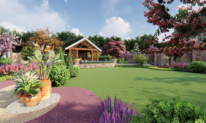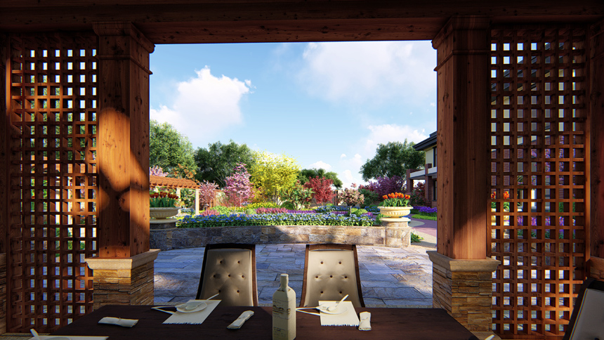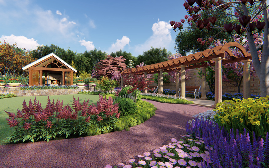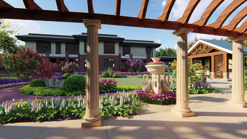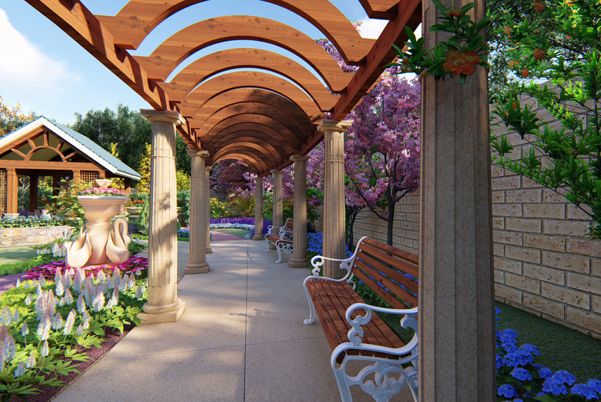 第二重围合形式,是外侧大椭圆,是庭院主要道路,廊架休息区安置于此处,这层围合形式代表外界给与的有力支持,从而使事业更加顺畅。廊架采用简欧造型,选材自然更是与庭院整个田园风格相呼应。廊架北侧有一景观节点,布以雕塑及花卉造景,让此处的观景效果更加丰富。