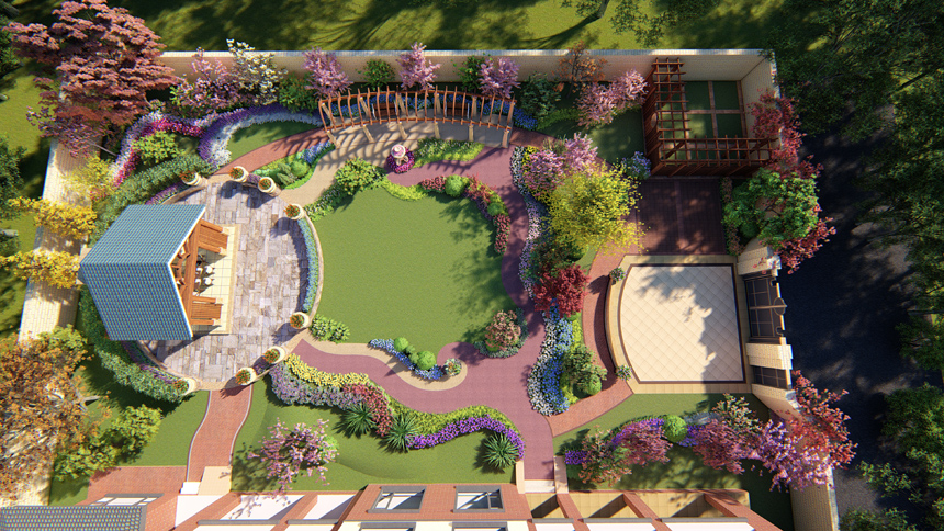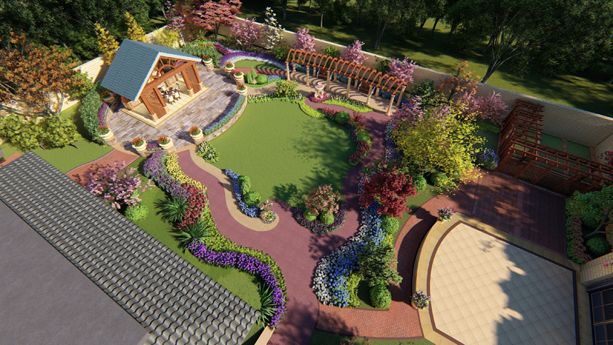 庭院整个布局基本为对称式环形布局,有两个轴线,东西主轴线和南北此轴线,轴线两侧被基本对称式布局形式,同时两个轴线又有椭圆形环抱型布局。